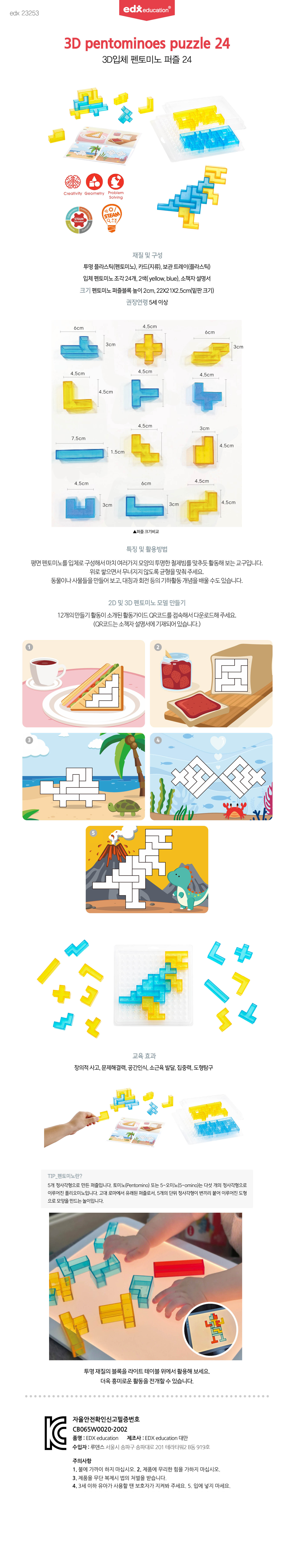 입체펜토미노조각24개,2색(YELLOW,BLUE)/소책자설명서/2CM(펜토미노퍼즐블록높이)/22×21×2.5CM(밑판)